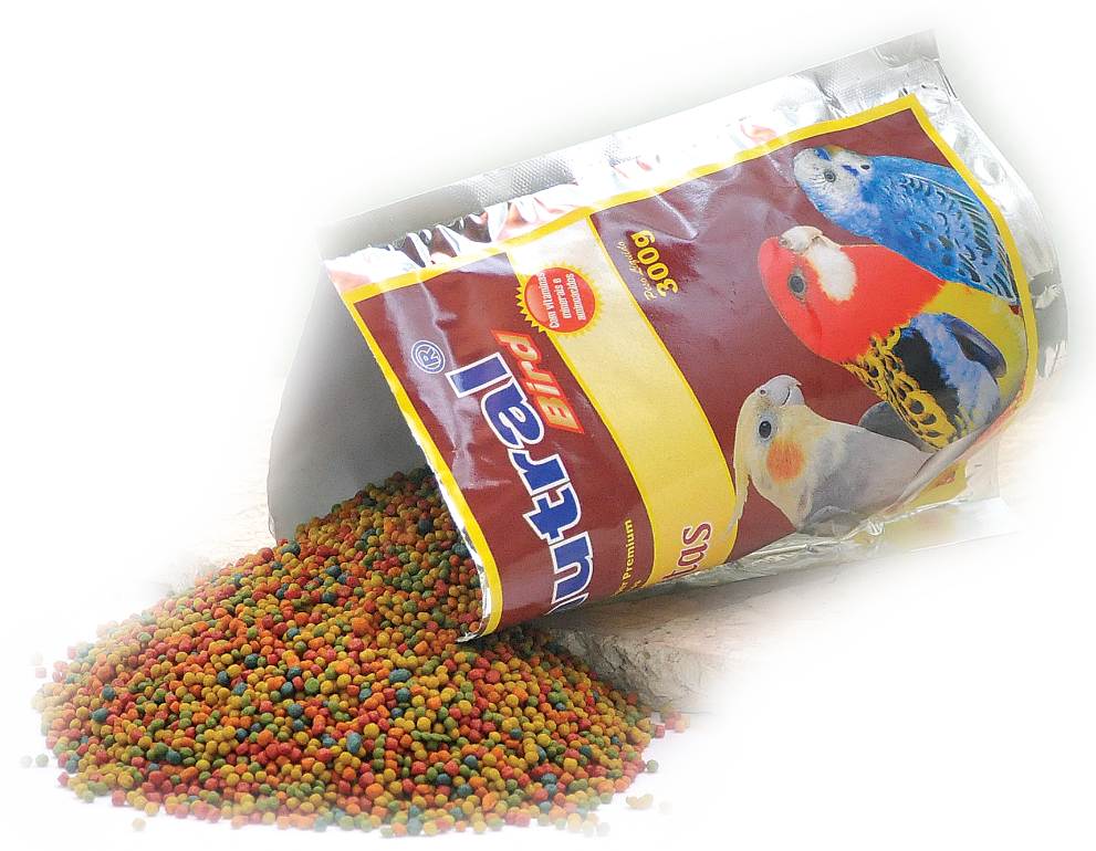 Alfafa, aveia, caulim, farelo de soja*, fosfato bicálcico, ovo desidratado, fubá de milho, gérmen de trigo, levedura seca de cervejaria, óleo de soja, farelo de glúten de milho 60%*, cloreto de sódio (sal comum), aroma artificial de banana, corante vermelho mistura, verde folha e amarelo tartrazina, amarelo crepúsculo.