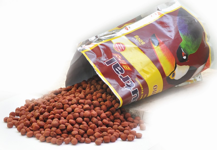 Quirera de arroz, quirera de milho, ovo desidratado, gérmen de trigo, farelo de soja, carbonato de cálcio, farinha de trigo, farinha de carne, alfafa desidratada, grão de aveia, mel, farelo de glúten 60%, levedura seca de cervejaria, óleo de soja, prémix vitamínico e mineral, fosfato bicálcico, cloreto de sódio (sal comum) e dl metionina.